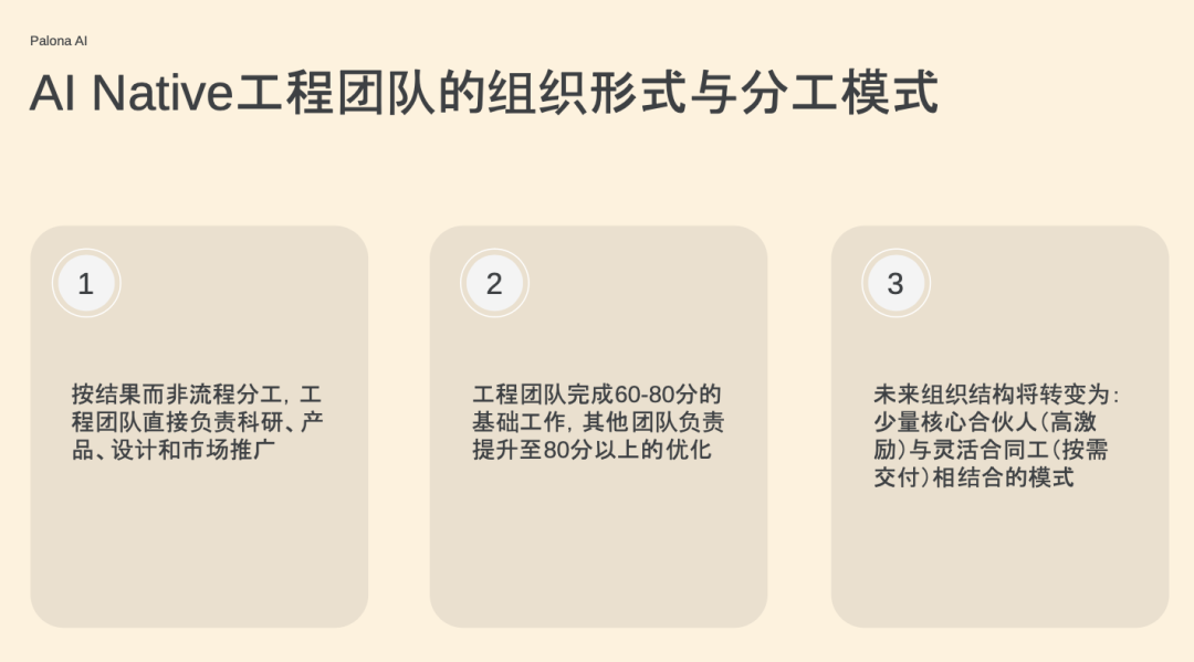 原因很简单:过去需要在每个环节安排不同的人,而在 AI 时代,可能 98% 的工作都能由 AI 完成,人类只需在 AI 做不了的地方补位。到那时,还按流程来分工明显就很不合理。