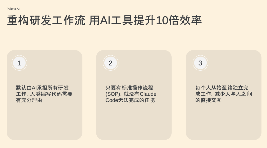 所以我们的做法是:让每个人从头到尾独立完成工作,尽量减少对齐。如果必须要对齐,那大家就把原则和想法写进 codebase,让人和人、人和 AI 在代码里自动对齐。