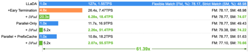 图9 在GSM8K(1024 tokens, 1-shot)任务上,LLaDA-1.5+Fast-dLLM+DPad实现了61.39倍的加速