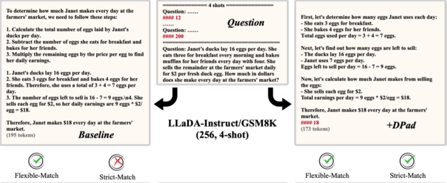 图5 「灵活匹配」得分和「严格匹配」得分。原始模型(左)没能按照「####」的格式输出答案,没能通过「严格匹配」;使用DPad(右)后模型成功「记得」按「####」输出答案,通过「严格匹配」