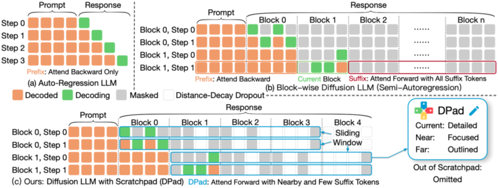 图4 (a)自回归模型;(b) 传统dLLM,需要关注所有后缀token;(c) DPad,仅关注附近少数经过筛选的后缀token