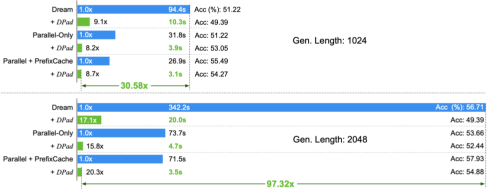 图10 在HumanEval(2048 tokens, 0-shot)任务上,Dream-Base+Fast-dLLM+DPad实现了97.32倍的加速
