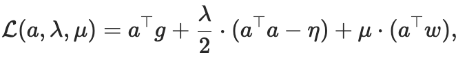 对这个拉格朗日函数对a求导并令其为零,然后结合两个约束条件求解λ和μ,就可以得到最优更新方向。