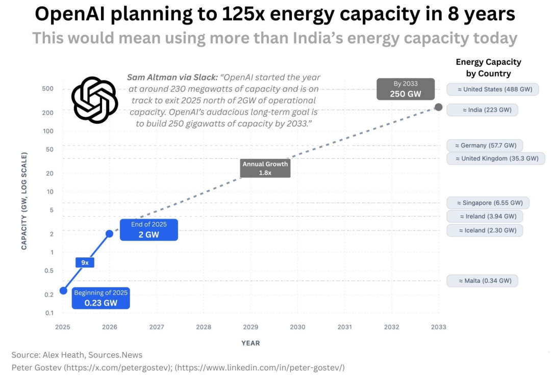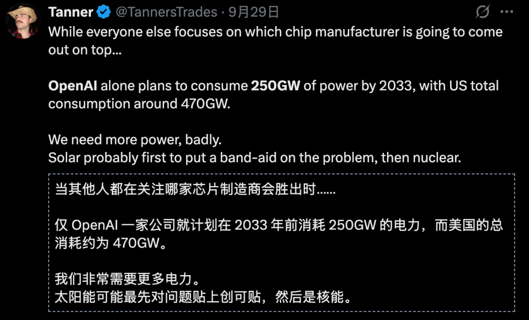 要知道,美国一个国家总共也就470GW的消耗,仅OpenAI一家公司就要「用掉」一半还多。