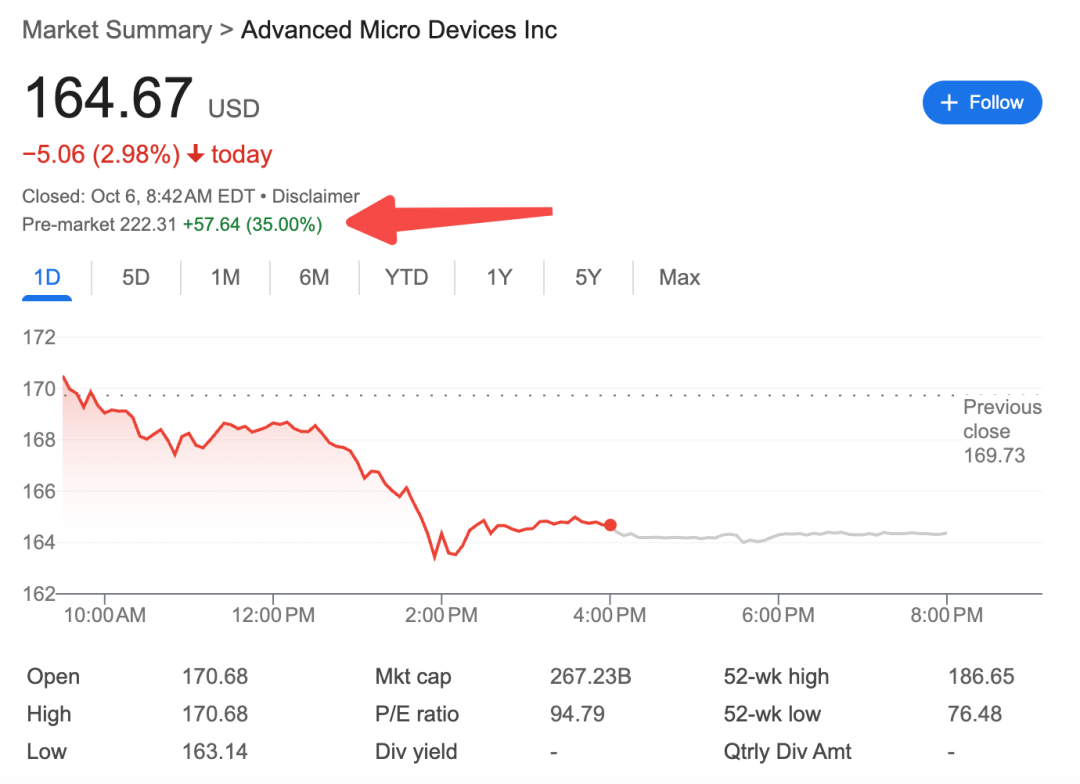 在我们后续的持续追踪中,AMD盘前股价最高上涨了35%!