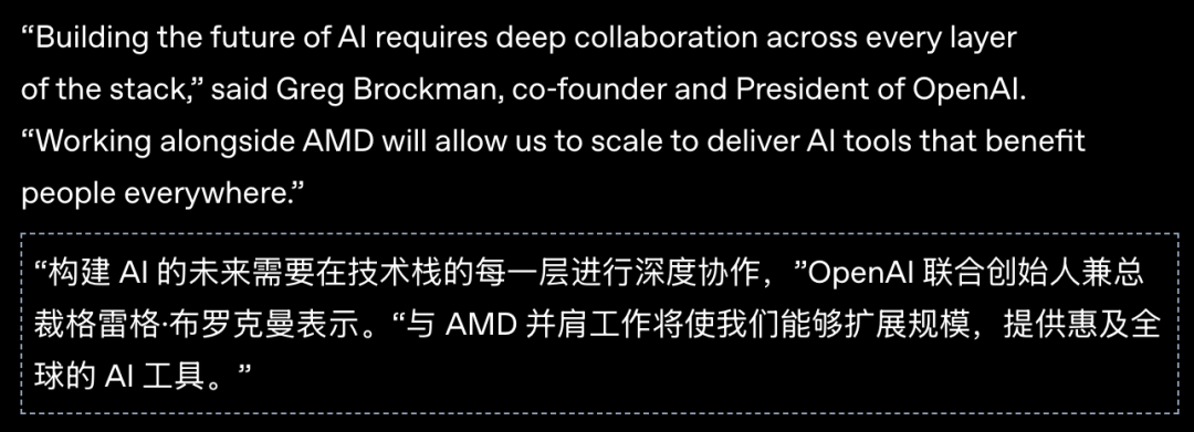 OpenAI的总裁Greg Brockman则表示:「构建AI的未来需要在技术栈的每一层进行深度协作,与AMD并肩合作将能够扩展规模,提供惠及全球的AI工具」。