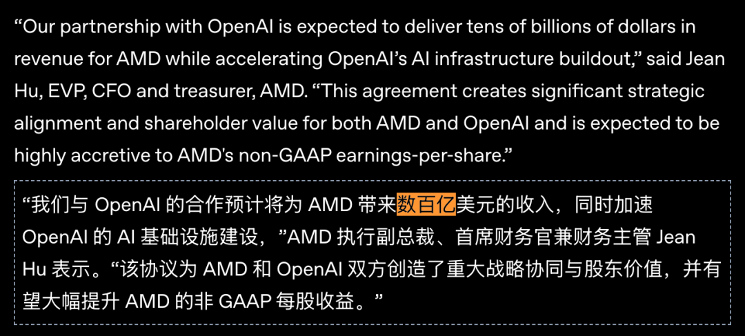 AMD执行副总裁,首席财务官预测,这次和OpenAI的合作将为AMD数百亿美元收入。