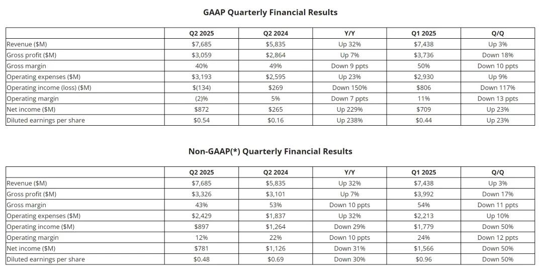 财报显示,AMD在2025年第二季度营收为76.85亿美元,较上年同期的58.35亿美元增长32%,较上一季度的74.38亿美元增长3%。