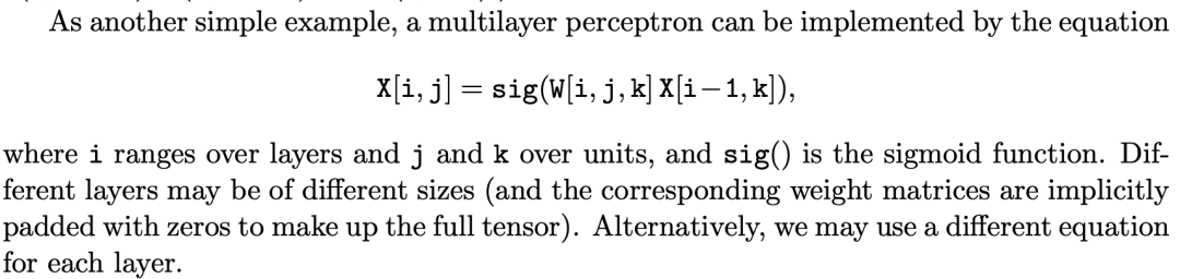 例如多层感知机(MLP)通过张量的乘法和激活函数定义隐藏层之间的映射,可用一个三维张量W来表示不同层的连接权重。