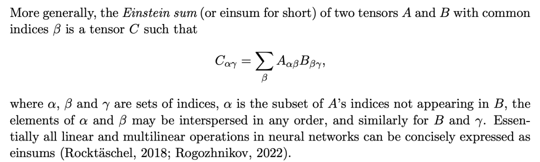 张量之间通过爱因斯坦求和约定进行乘法和求和操作,未出现在等式左侧的索引自动被求和,出现在左侧的索引表示保留维度。