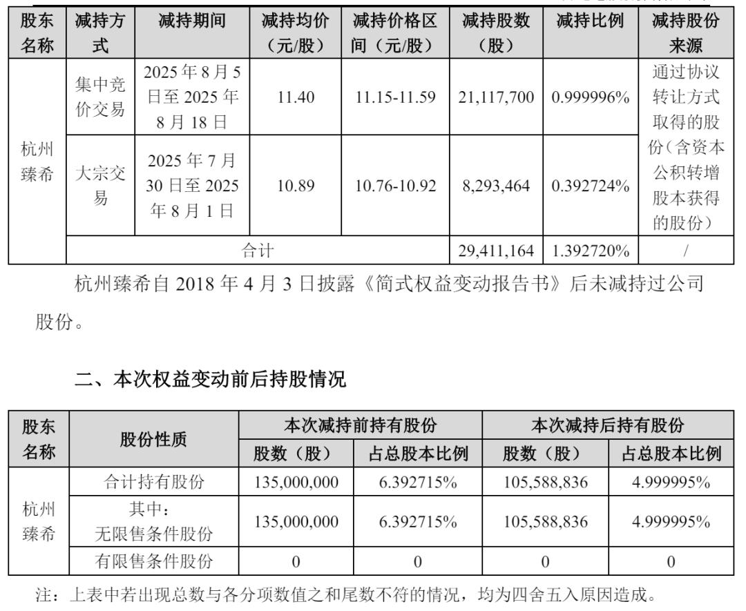 杭州臻希一共套现超过3亿元,此次减持后,杭州臻希持股从6.392715%降至5%以下。
