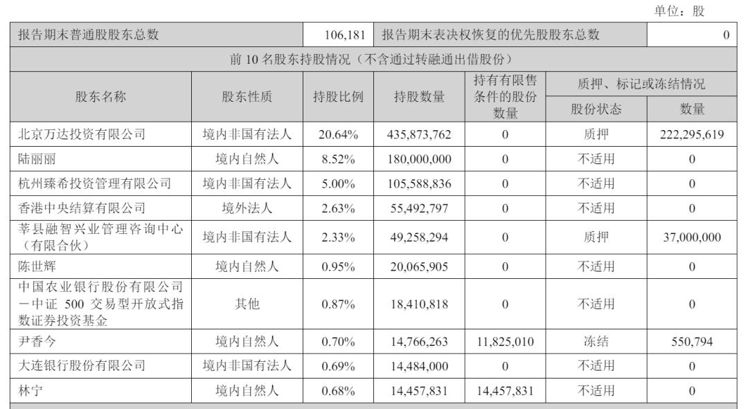 截至2025年6月30日,万达投资持股20.64%,陆丽丽持股为8.52%,杭州臻希投资管理有限公司持股6.39%,莘县融智兴业管理咨询中心(有限合伙)持股4.33%,香港中央结算有限公司持股为2.41%;