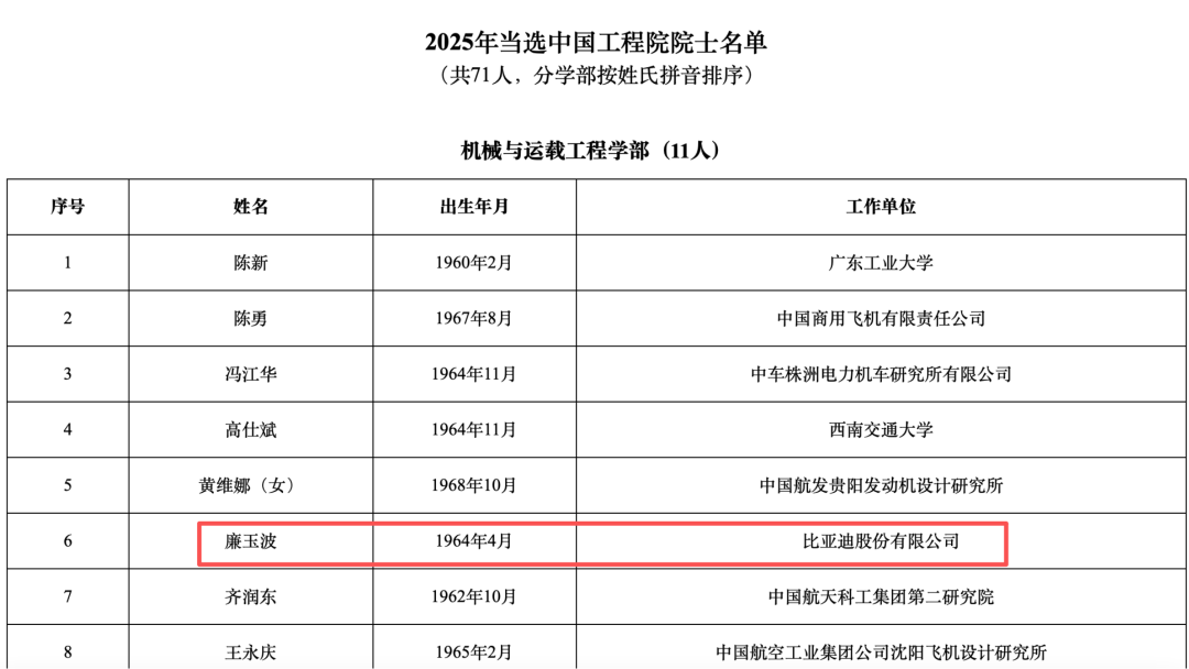 两院院士当选名单刚刚公布,比亚迪首席科学家——廉玉波,成功当选中国工程院院士