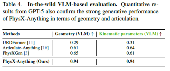 基于VLM的评估:为评估方法的泛化能力,团队进一步在真实世界图像上测试其性能。这些图像覆盖了最常见的日常物体类别。为避免VLM在某些具体物理属性上判断不稳定的问题,本次评估重点放在几何与关节运动质量上。结果表明,PhysX-Anything在几何与运动学参数两项指标上均显著优于所有对比方法,显示出对真实输入的强泛化能力。