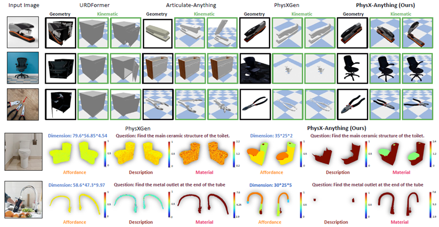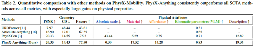研究团队将PhysX-Anything与当前最新方法URDFormer、Articulate-Anything和PhysXGen进行对比。如下表所示,PhysX-Anything在几何与物理两类指标上均取得最优表现。得益于强大的VLM先验,其在绝对尺度上的误差大幅降低。此外,由于VLM结构适合处理文本,PhysX-Anything在文本描述相关指标上也取得最高得分,表明该方法方法不仅能够生成物理上合理的属性,还能产出连贯的、具备部件层级的文字描述,对物体结构与功能具备较强理解能力。