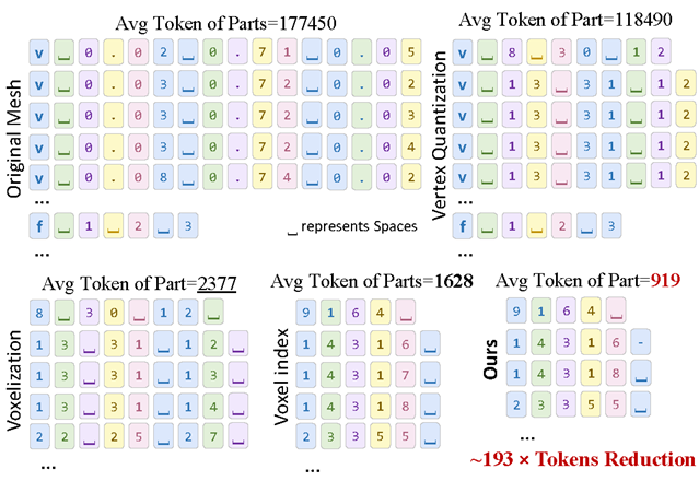 在传统视觉语言模型(VLM)中进行3D生成时,为压缩原始网格的token长度,主流方法通常采用基于顶点量化的文本序列表示,但所得几何token仍十分冗长。3D VQ-GAN虽可进一步压缩几何token,却需要在微调阶段引入额外特殊token和自定义tokenizer,增加了训练与部署的复杂度。