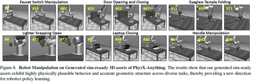 该实验不仅展示了生成资产在物理行为与几何结构上的高度可信性,也突显了它们在推动多种下游机器人与具身智能应用方面的巨大潜力。