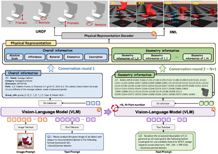 在上述物理3D资产表征的基础上,研究团队采用Qwen2.5作为基础模型,并在自建的物理3D数据集上对该VLM进行微调。通过精心设计的多轮对话流程,PhysX-Anything能同时生成高质量的全局描述(整体物理与结构属性)与局部信息(部件级几何)。