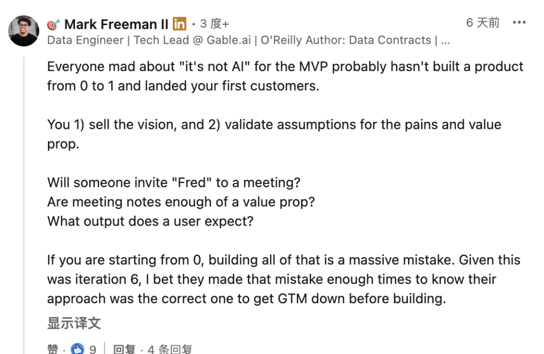 一名数据工程师指出,「先人工、后智能」对初创公司来说是种很聪明的做法,它能在低成本下验证产品价值与真实需求。