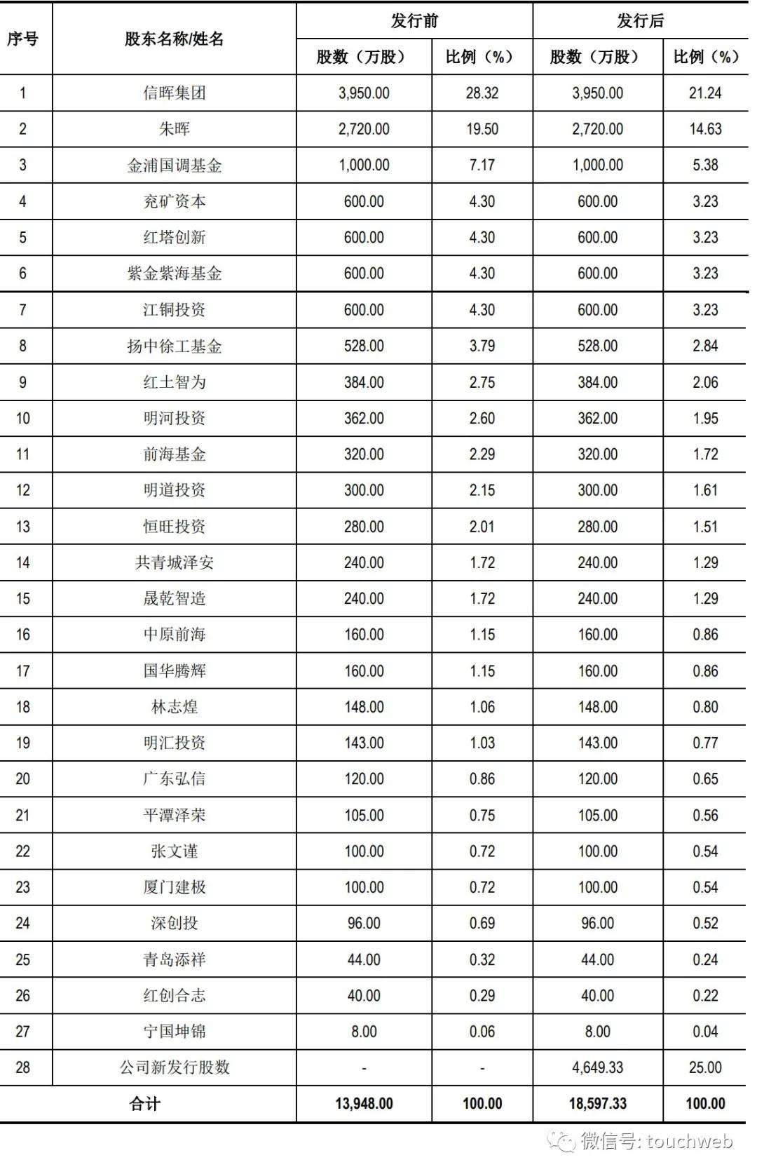 IPO后,信晖集团持股为21.24%,朱晖持股为14.63%,金浦国调基金持股为5.38%,兖矿资本、红塔创新、紫金紫海基金、江铜投资分别持股为3.23%,扬中徐工基金持股为2.84%,红土智为持股为2.06%,明河投资持股为1.95%,前海基金持股为1.72%,明道投资持股为1.61%;