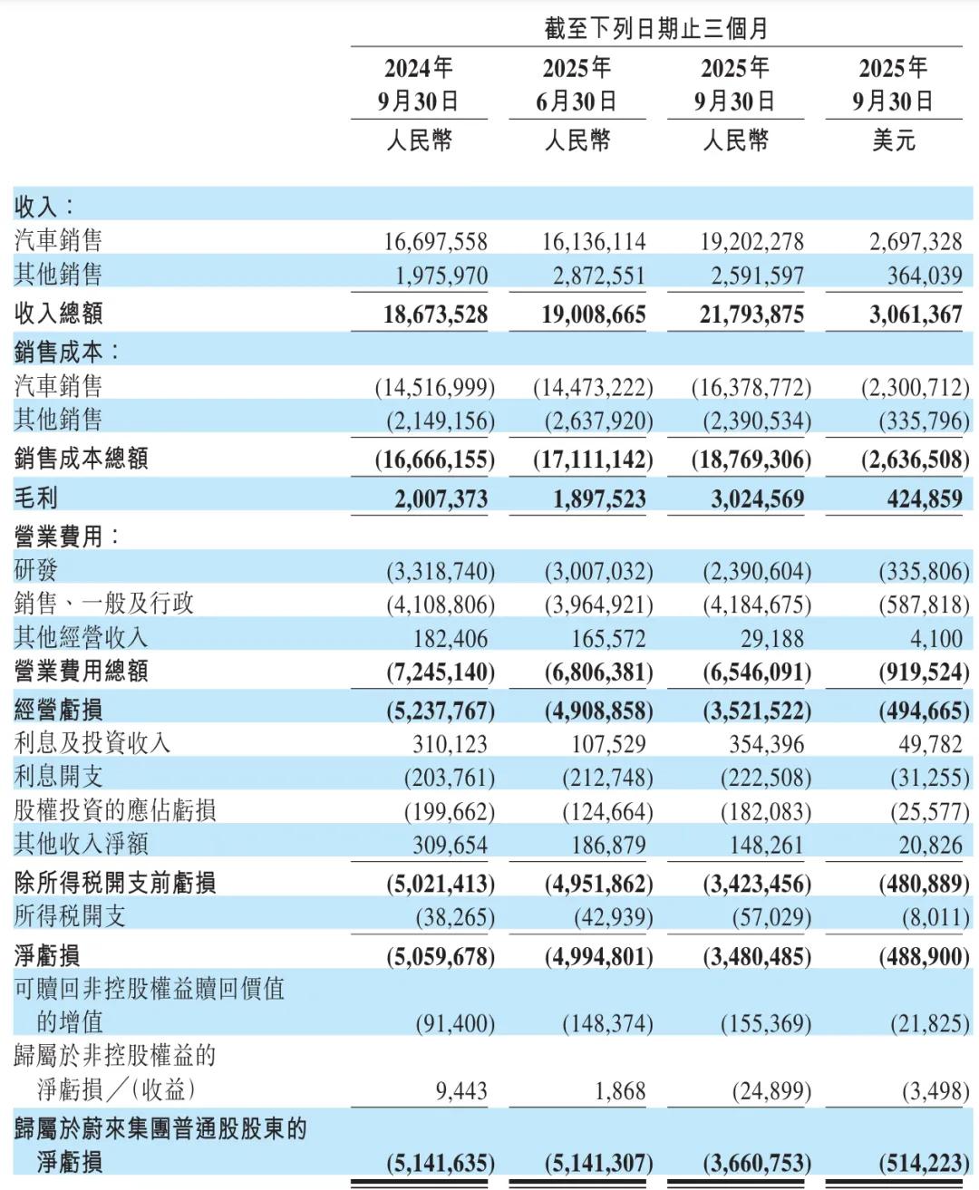 蔚来2025年第三季经营亏损35.215亿元(4.947亿美元),较上年同期下降32.8%;净亏损34.805亿元(4.889亿美元),较上年同期下降31.2%。