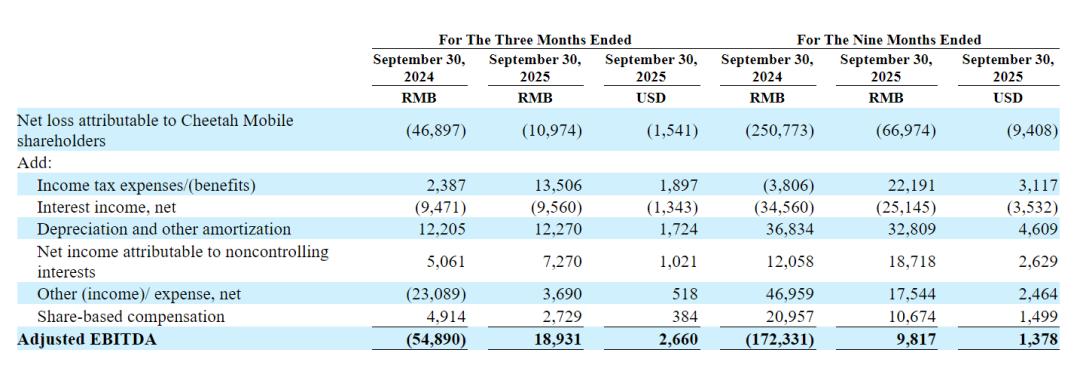 猎豹移动2025年第三季度经调整EBITDA为1893万元,上年同期为-5489万元。