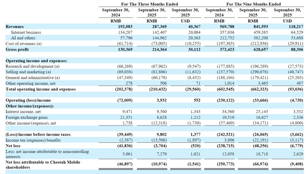 猎豹移动2025年第三季度营收为2.87亿元(约4040万美元),其中,互联网业务(Internet business)收入为1.42亿元,上年同期为1.34亿元;AI及其他业务收入为1.45亿元(约2036万美元),上年同期为5780万元。
