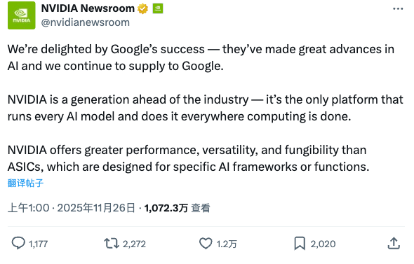 上周谷歌横扫科技媒体头条,如坐针毡的英伟达官方X账号发了条推文,主打先礼后兵,一边点赞一边阴阳怪气。