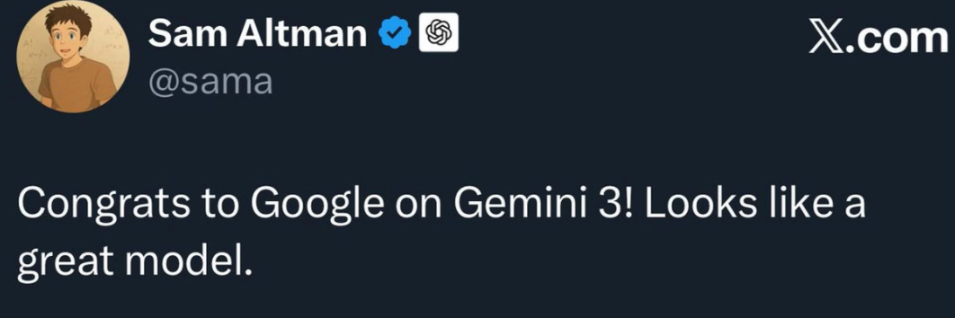 身为友商,奥特曼罕见发推祝贺,称Gemini-3“看起来很棒”,转头在员工备忘录中表示贵司必须得“快速追赶”。