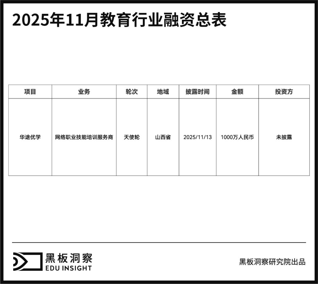 2025年11月,教育行业仅披露1起融资事件,融资总金额为1000万元人民币。融资企业为专注职业技能培训的在线教育平台——太原华途优学教育科技发展有限公司。在整体融资环境趋于理性、资本审慎筛选投资标的的背景下,华途优学教育仍获得千万元天使轮投资,凸显职业教育赛道在国家战略与市场需求双重驱动下的持续韧性与增长潜力。