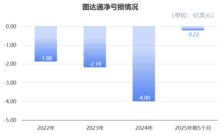 2022年到2024年,图达通税前亏损分别为1.88亿美元(约13.7亿元人民币)、2.19亿美元(15.9亿元人民币)和4亿美元(约28亿元);今年前5个月,净亏损为2149万美元(约1.5亿元)。