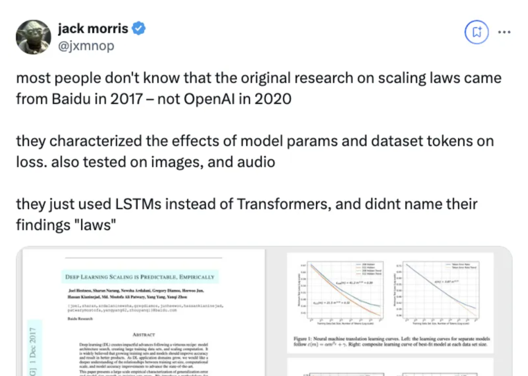 这个概念被OpenAI带火之后,一位Meta研究员找出了百度2017年发表的一篇论文,结果发现论文里早就谈到了Scaling Law问题,只是没有相关正式命名。