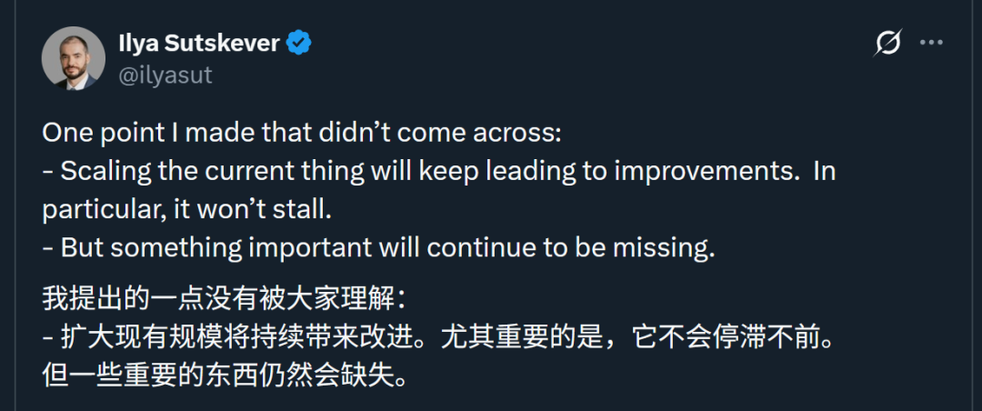 后来他还特意解释道,不是说继续扩展规模不会带来变化,只是有些重要的东西仍然会缺失。