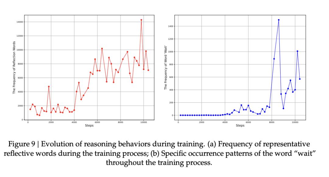 在v1版本中,DeepSeek展示过一个现象:随着思考时长的Scaling,模型会在某个时刻突然出现学会「反思」。