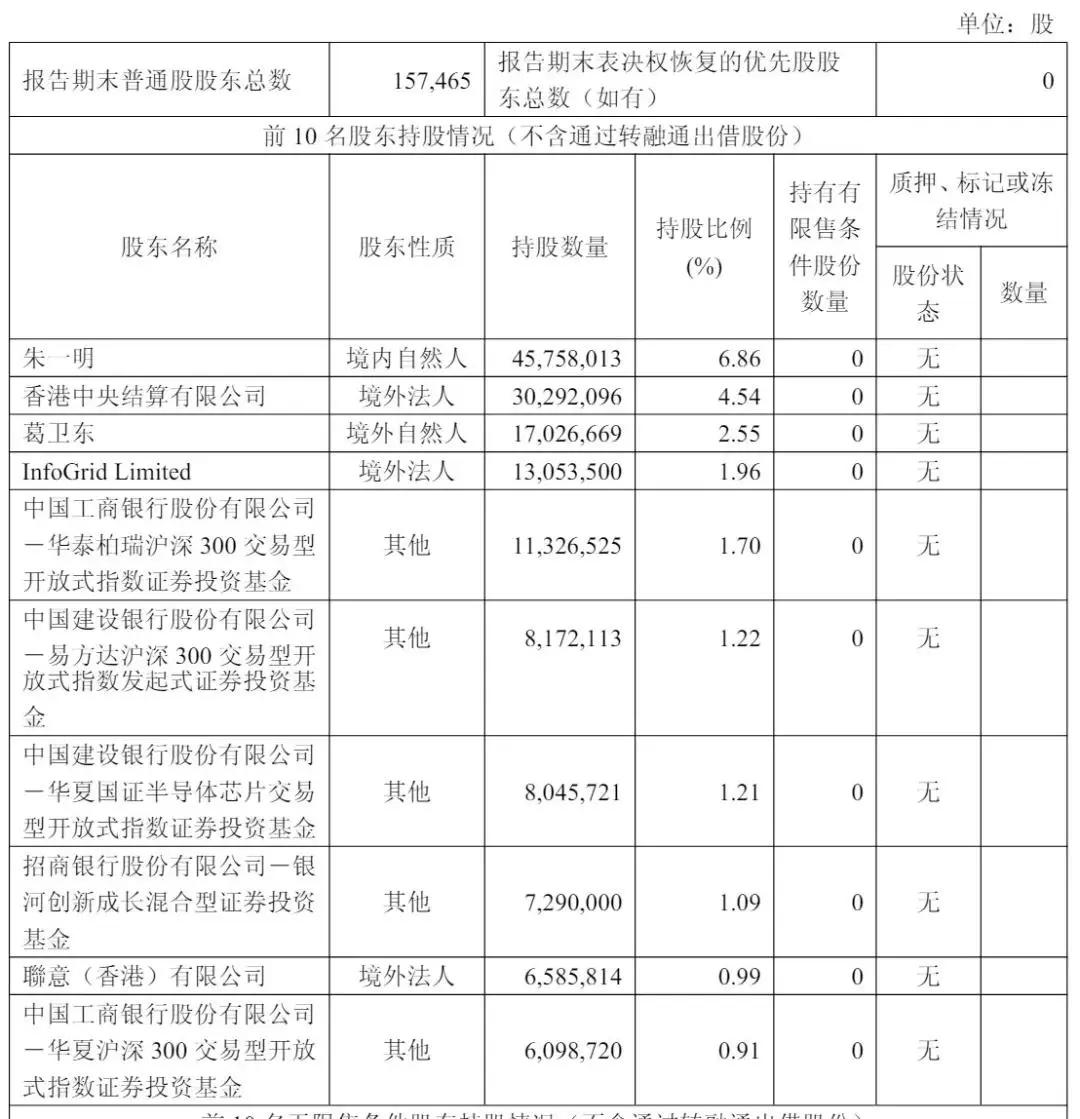 截至2025年9月30日,朱一明持股为6.86%,香港中央结算有限公司持股为4.54%,葛卫东持股为2.55%;