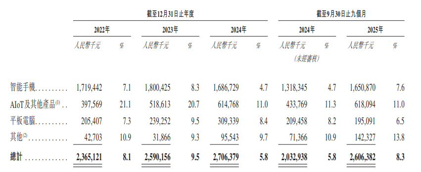 其中,智能手机是公司主要的收入来源,2022年~2024年已经2025年前9个月,相关收入分别为242.7亿元、218.2亿元、361.3亿元以及217亿元,分别占同期总收入的82.7%、80.3%、77.9%和69.3%。