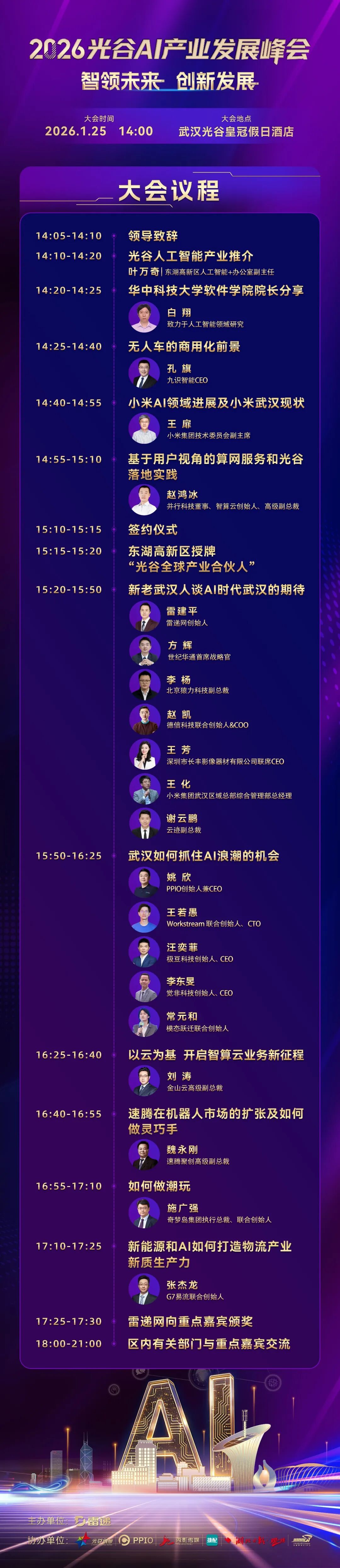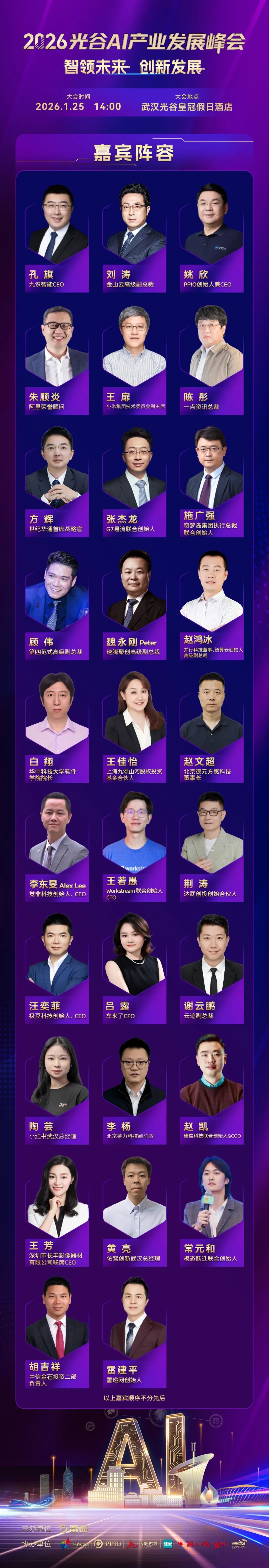 《2026光谷AI产业发展峰会》主要围绕着人工智能、无人车、云计算、电动汽车、车联网、潮玩等众多话题展开讨论,九识智能CEO孔旗、PPIO派欧云创始人姚欣、世纪华通集团CSO方辉、金山云高级副总裁刘涛、速腾聚创高级副总裁魏永刚、奇梦岛执行总裁施广强、小米集团技术委副主席王扉、华中科技大学软件学院院长白翔、觉非科技创始人李东旻、极豆车联网CEO汪亦菲、G7易流联合创始人张杰龙、并行科技董事、智算云创始人、高级副总裁赵鸿冰、猿力科技副总裁李杨、云迹副总裁谢云鹏、Workstream联合创始人、CTO王若愚、雷递网创始人雷建平等将现场进行分享。
