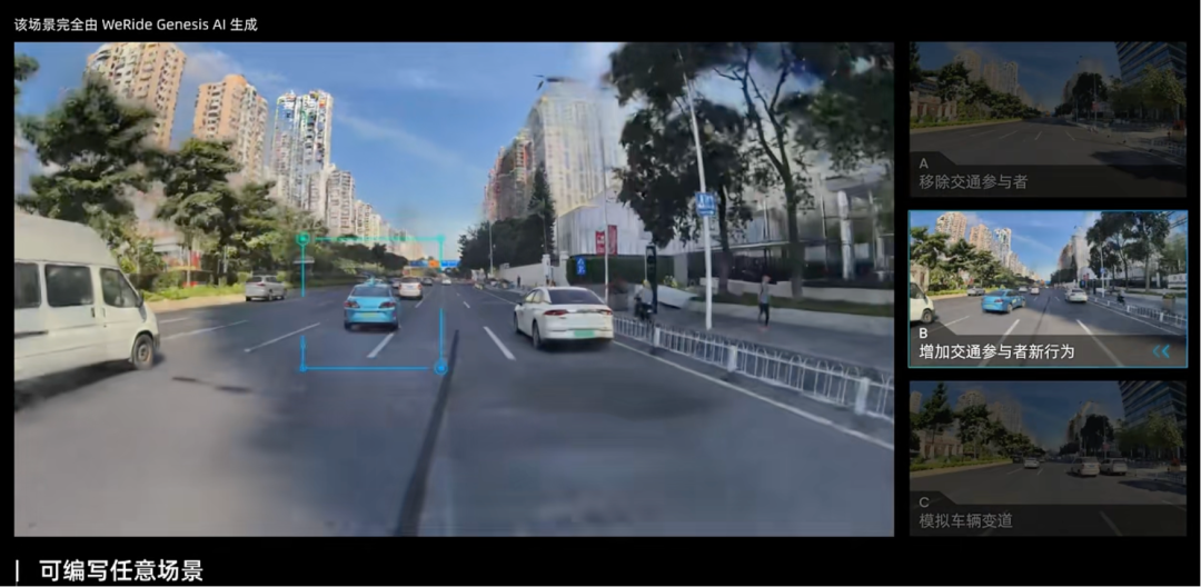通用的另一个含义,是WeRide GENESIS本身对于环境的精准构建,几乎能“一句话”无限生成、回放和变化“长尾场景”: