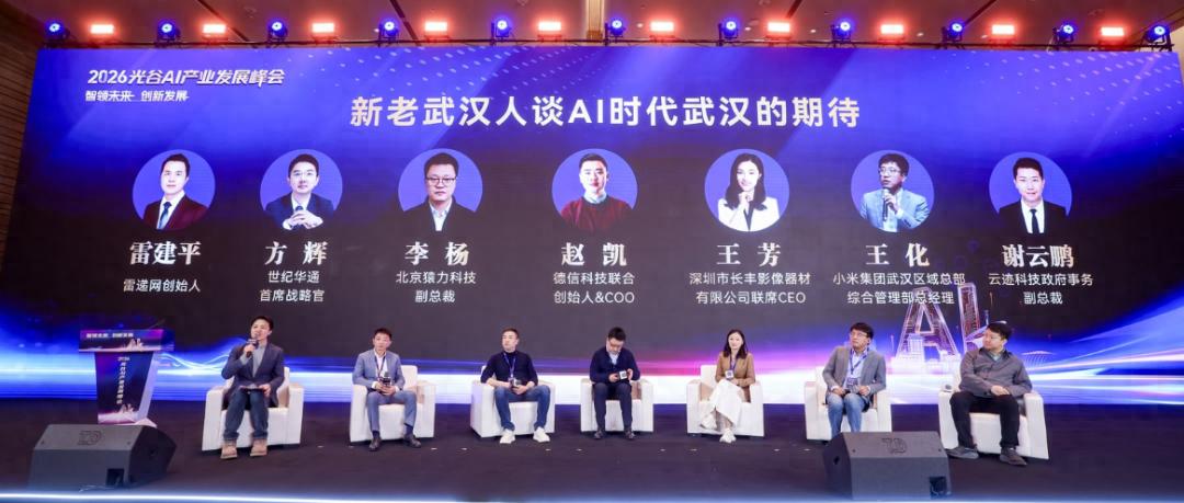 由雷递网主办的《2026光谷AI产业发展峰会》1月25日在光谷皇冠假日酒店召开,雷递网创始人雷建平与世纪华通集团CSO方辉、猿力科技副总裁李杨、云迹副总裁谢云鹏、德信科技联合创始人、COO赵凯、深圳市长丰影像器材有限公司联席CEO王芳、小米集团武汉区域总部综合管理部总经理王化等嘉宾进行了《新老武汉人对AI时代武汉的期待》的圆桌讨论。