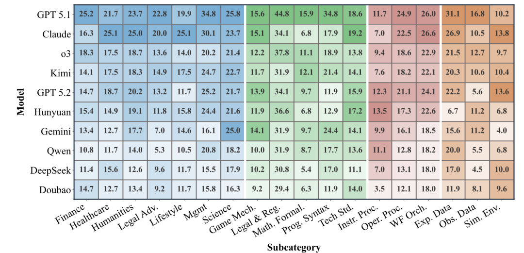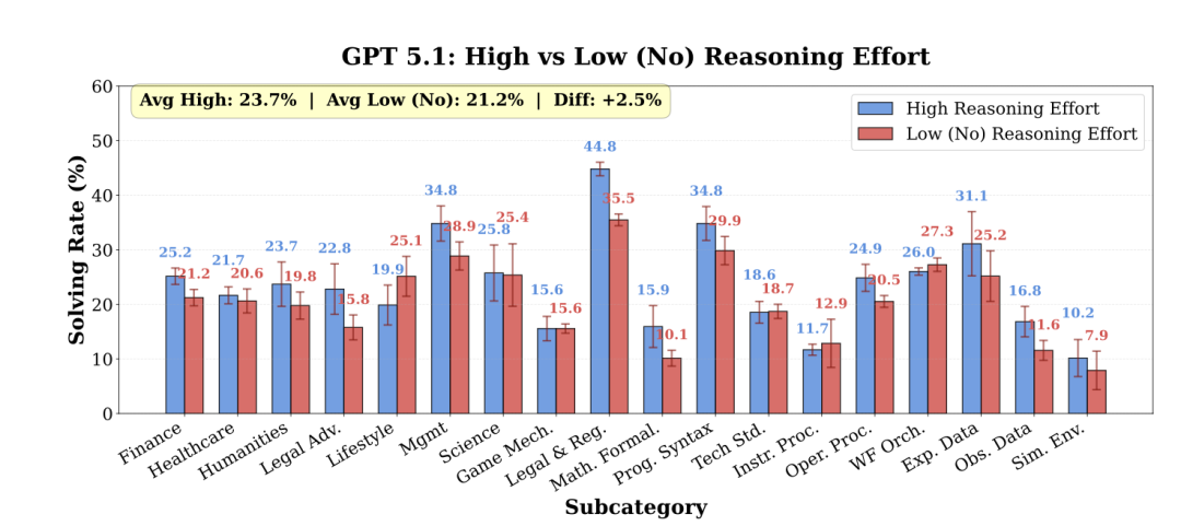 平均而言,模型仅解决了17.2%的任务,即便是表现最好的GPT-5.1 (High)也仅达到23.7%。
