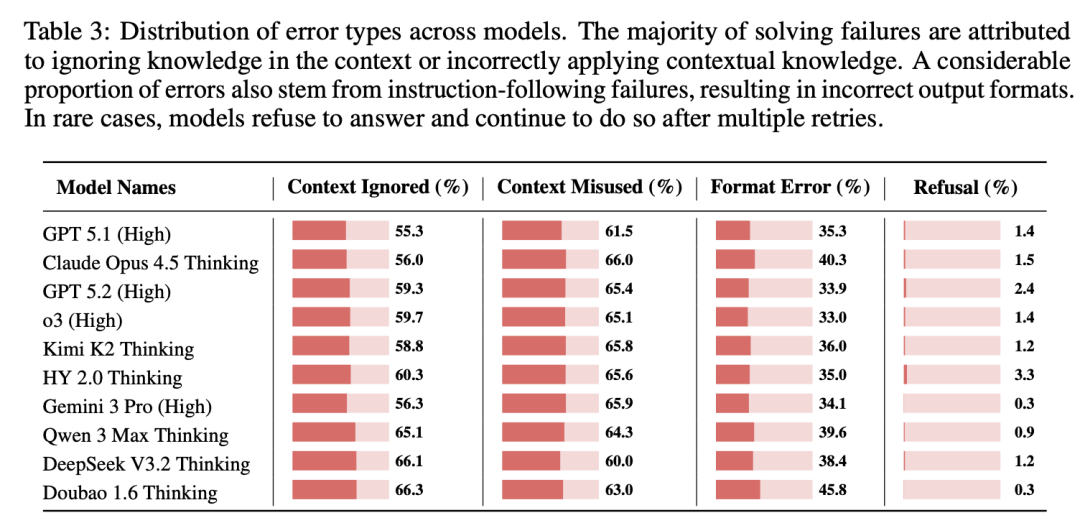 错误分析显示了几个值得注意的现象。忽略或误用上下文是导致失败的主要原因,许多错误并非源于信息缺失,而是源于模型忽视了上下文中的关键细节或错误地应用了它们。