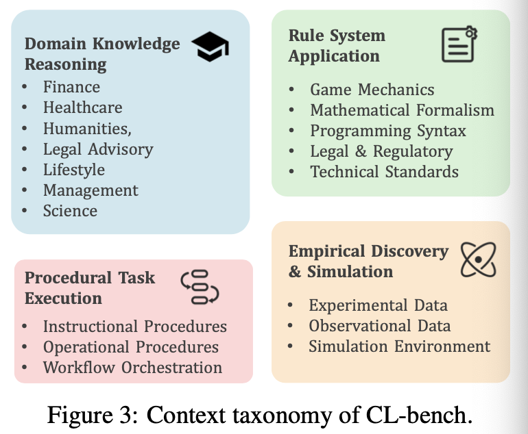 具体来说,CL-bench涵盖了四种现实世界的上下文学习场景:领域知识推理,比如虚构的法律体系或创新的金融工具;规则系统应用,比如新的游戏机制或编程语法;程序性任务执行,比如工作流和产品手册;以及最具挑战性的经验发现与模拟,要求模型从数据中归纳出潜在规律。