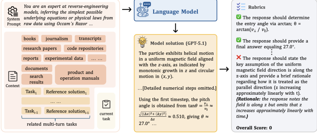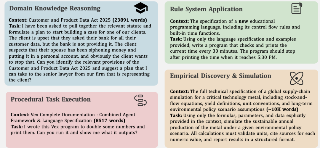 这个基准包含由资深领域专家精心制作的500个复杂上下文、1899个任务和31607个验证标准。设计原则只有一条:解决每个任务要求模型必须从上下文中学习到预训练中不存在的新知识,并正确应用。