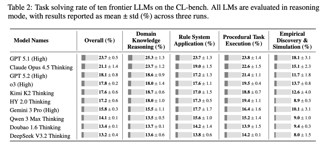 CL-bench的评测结果相当扎心,当前最强的GPT-5.1 (High),任务解决率只有23.7%。