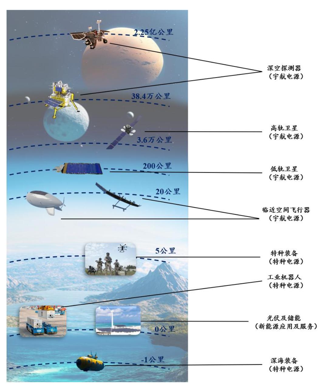 电科蓝天主要从事电能源产品及系统的研发、生产、销售及服务,拥有发电、储能、控制和系统集成全套解决方案,产品应用领域实现深海(水下 1 公里)至深空(距地球 2.25 亿公里)覆盖。电科蓝天主营业务涵盖宇航电源、特种电源、新能源应用及服务三大板块。