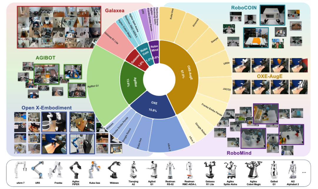 高德先将OXE, AgiBot-Beta, RoboCoin, RoboMind, Galaxea 等六个主流开源数据集整合,然后进行标准化清洗。这里主要有两个策略,一个是统一动作空间,将所有动作统一转换为末端执行器坐标系下的增量动作,并使用旋转向量表示方向,提高预测稳定性。