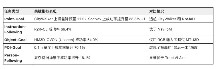 通过这种方式,ABot-NO在5类任务的7个基准测试中实现了SOTA,并且走出实验室,在室内外场景中完成了拿外卖、找人和跨楼层导航等长序列任务。