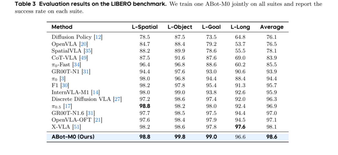 实验结果显示,ABot-MO在Libero, Libero-Plus, RoboCasa等基准测试中,实现了平均任务成功率SOTA,超过pi0和UniVLA。
