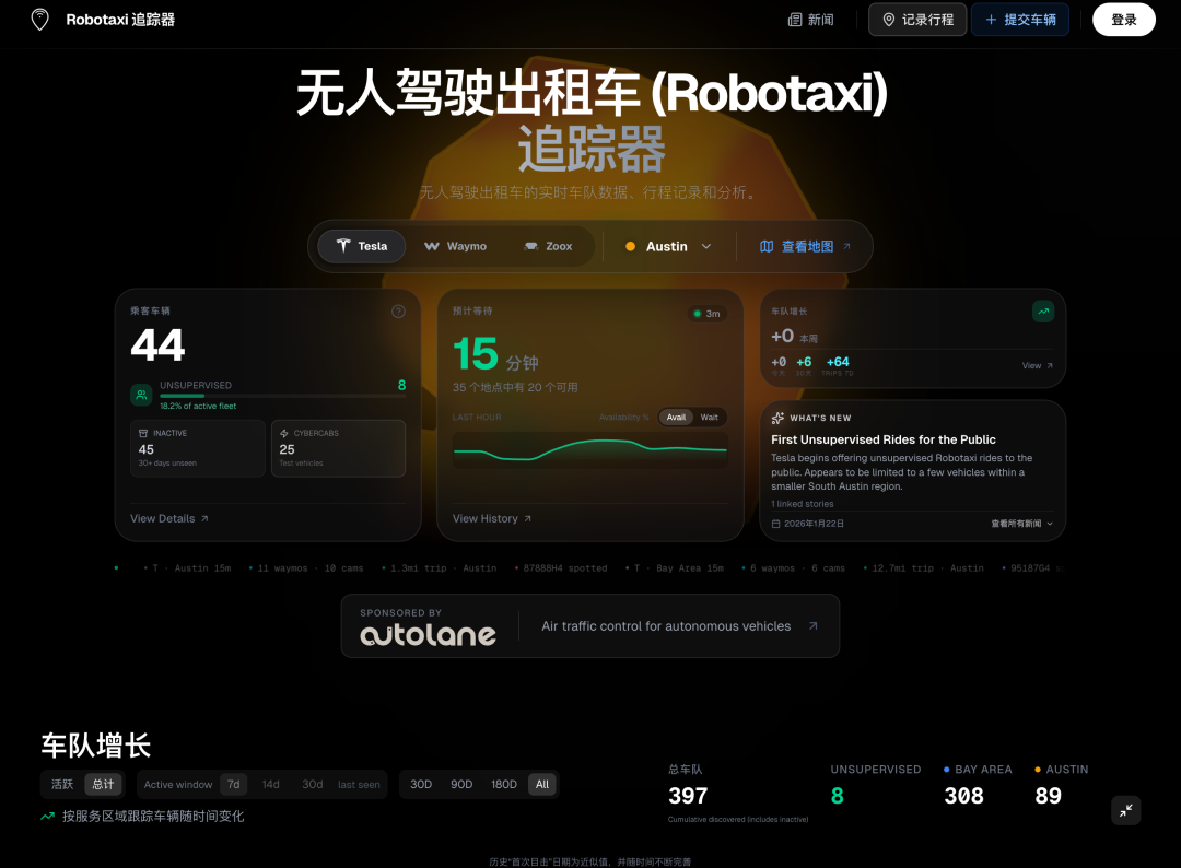 奥斯汀正是特斯拉总部所在地,也是特斯拉最早上线Robotaxi服务的城市。据麦克坎纳介绍,特斯拉在他老家部署Robotaxi后,他出于好奇想了解Robotaxi车队进展,于是开发了一个网站:「Robotaxi追踪器」。