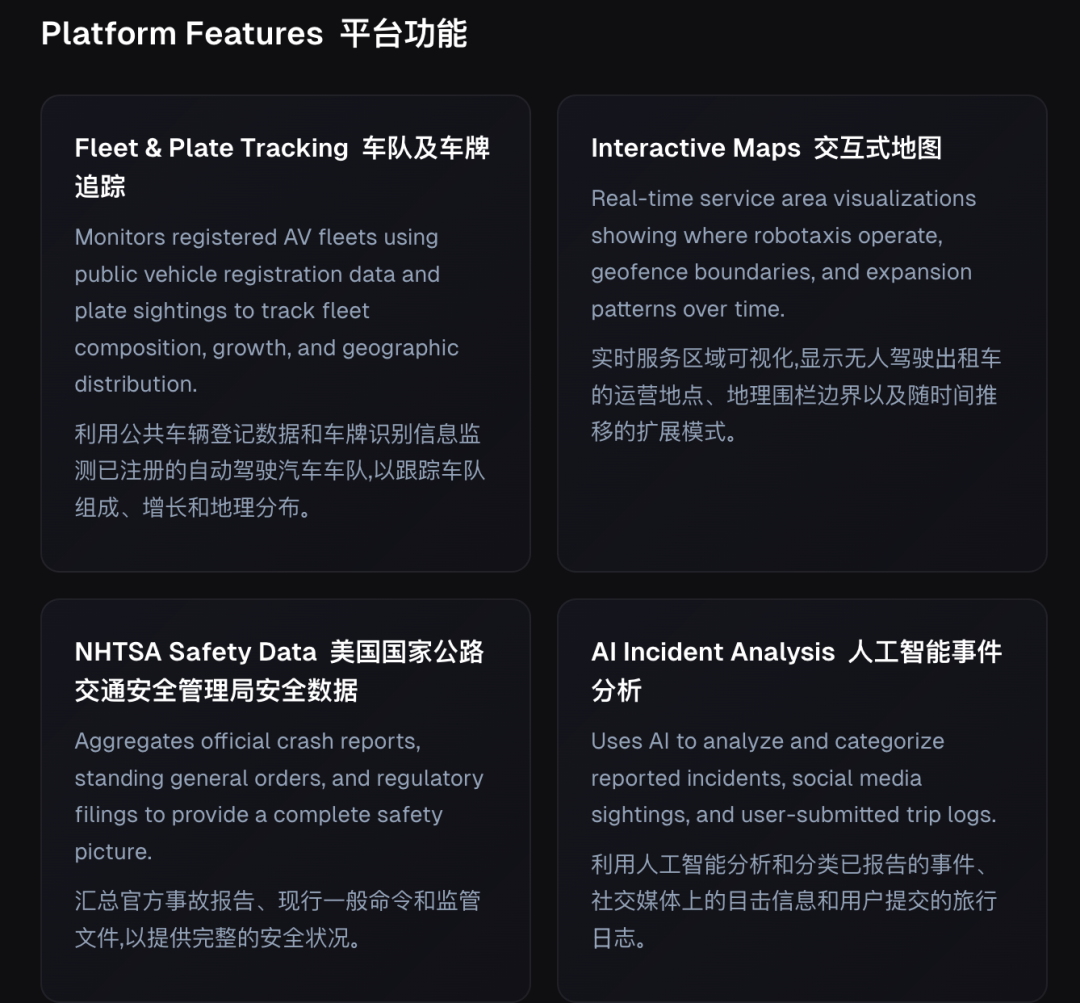 Robotaxi追踪器汇总了公开数据,包括车辆登记信息、车牌号、车辆所在地地图和交管局事故等。AI会利用这些数据,结合社交平台的目击信息分析,最终得出当地的车队情况。